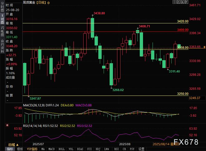 现货黄金周一(8月25日)亚市早盘承压走低至3361美元/盎司附近,主要受美元走强影响。不过,在美联储主席鲍威尔于杰克逊霍尔研讨会发表讲线月降息的乐观情绪升温,这可能会限制黄金的下跌空间。